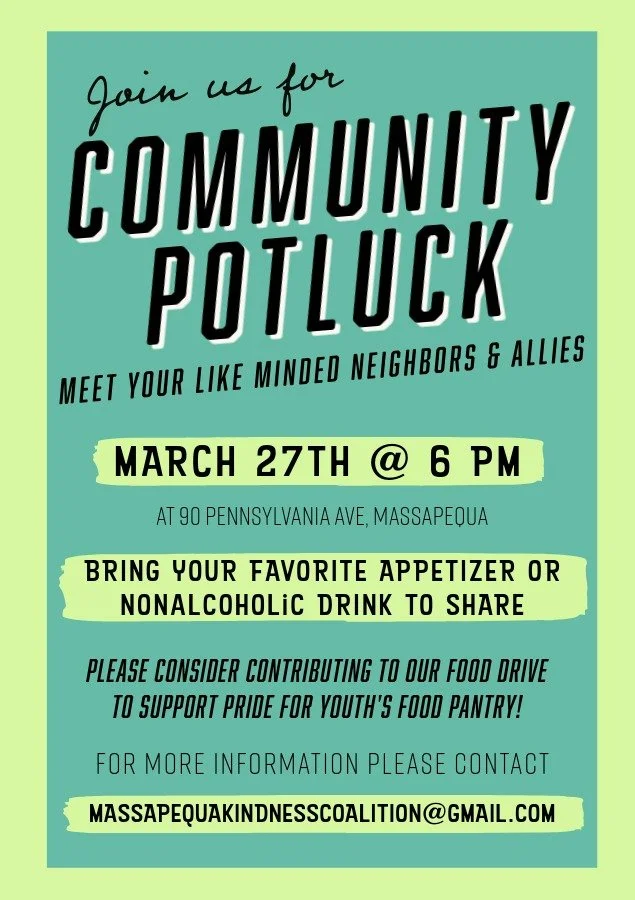 Join us for an all ages community potluck! Come meet like-minded Massapequa neighbors and our allies in a warm, welcoming environment. Bring your favorite appetizer and/or non-alcoholic beverage to share. Coloring and a simple craft will be provided for both our young and young at heart community members.