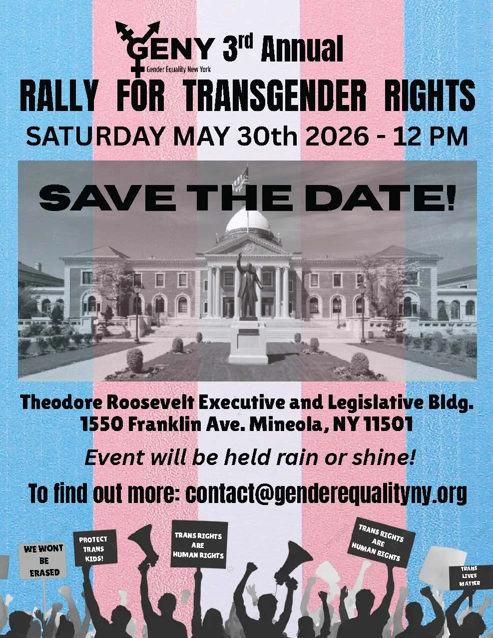 Back to All Events Rally for Transgender Rights Saturday, May 30, 2026 12:00 PM 1:00 PM Theodore Roosevelt Executive and Legislative Building 1550 Franklin Avenue Mineola, NY, 11501 United States (map) Google Calendar ICS Join the Massapequa Kindness Coalition as we stand with Gender Equality NY in their 3rd Annual Rally for Transgender Rights! This event will be held rain or shine. For more information, please contact Gender Equality NY, contact@genderequalityny.org